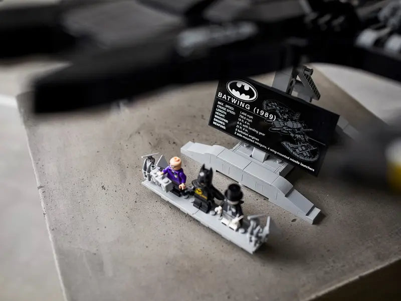 - The iconic style of the Batwing from the 1989 BATMAN movie is enhanced by a sturdy stand, nameplate and 3 minifigures: BATMAN, THE JOKER and a Boombox goon.