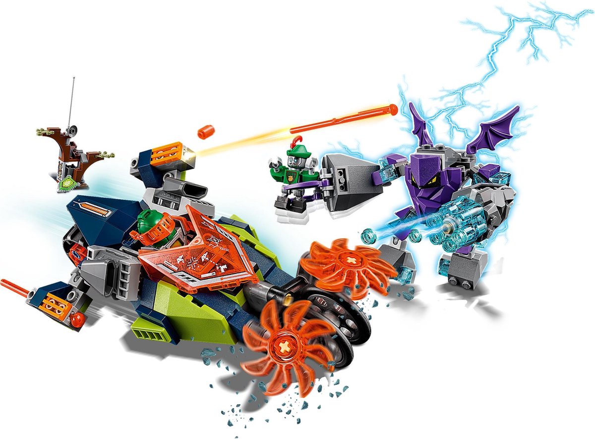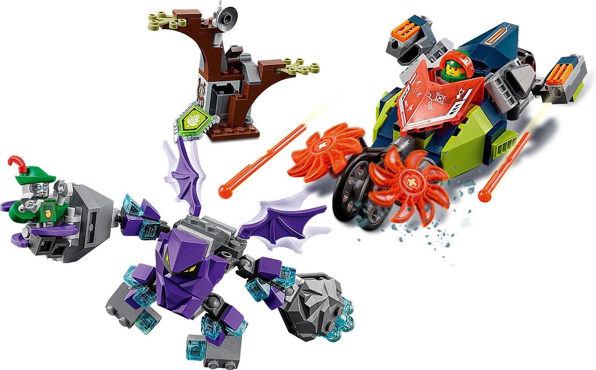 - Features Aaron’s Stone Destroyer with dual flick missiles, spinning stone slicers, weapon holder, and a minifigure cockpit, plus Robot Hoodlum’s forest hideout setting with buildable tree, branch elements and a firing catapult.