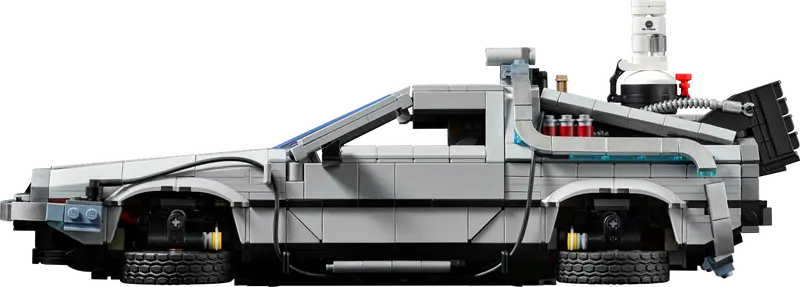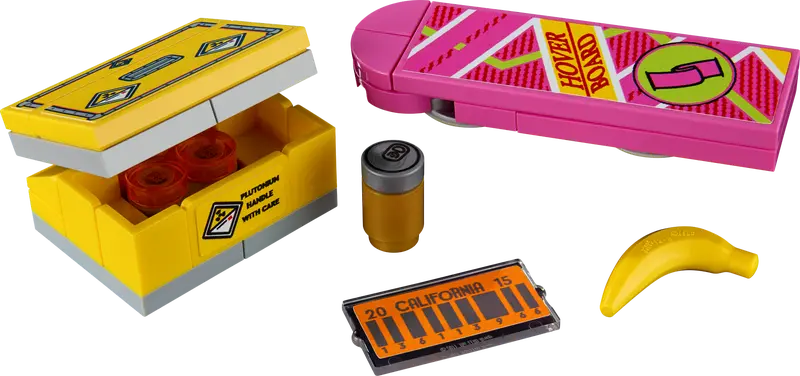 - The DeLorean also features Doc and Marty McFly minifigures and fun accessories like a hoverboard, banana and a soda can.
