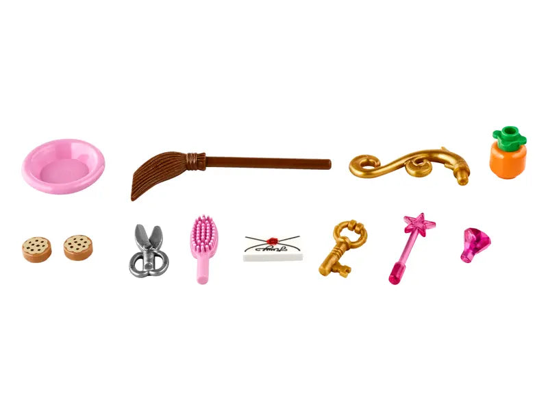 - Accessory elements include an invitation, 2 keys, magic wand, broom, hairbrush, scissors, plate with food and a piece of cheese.