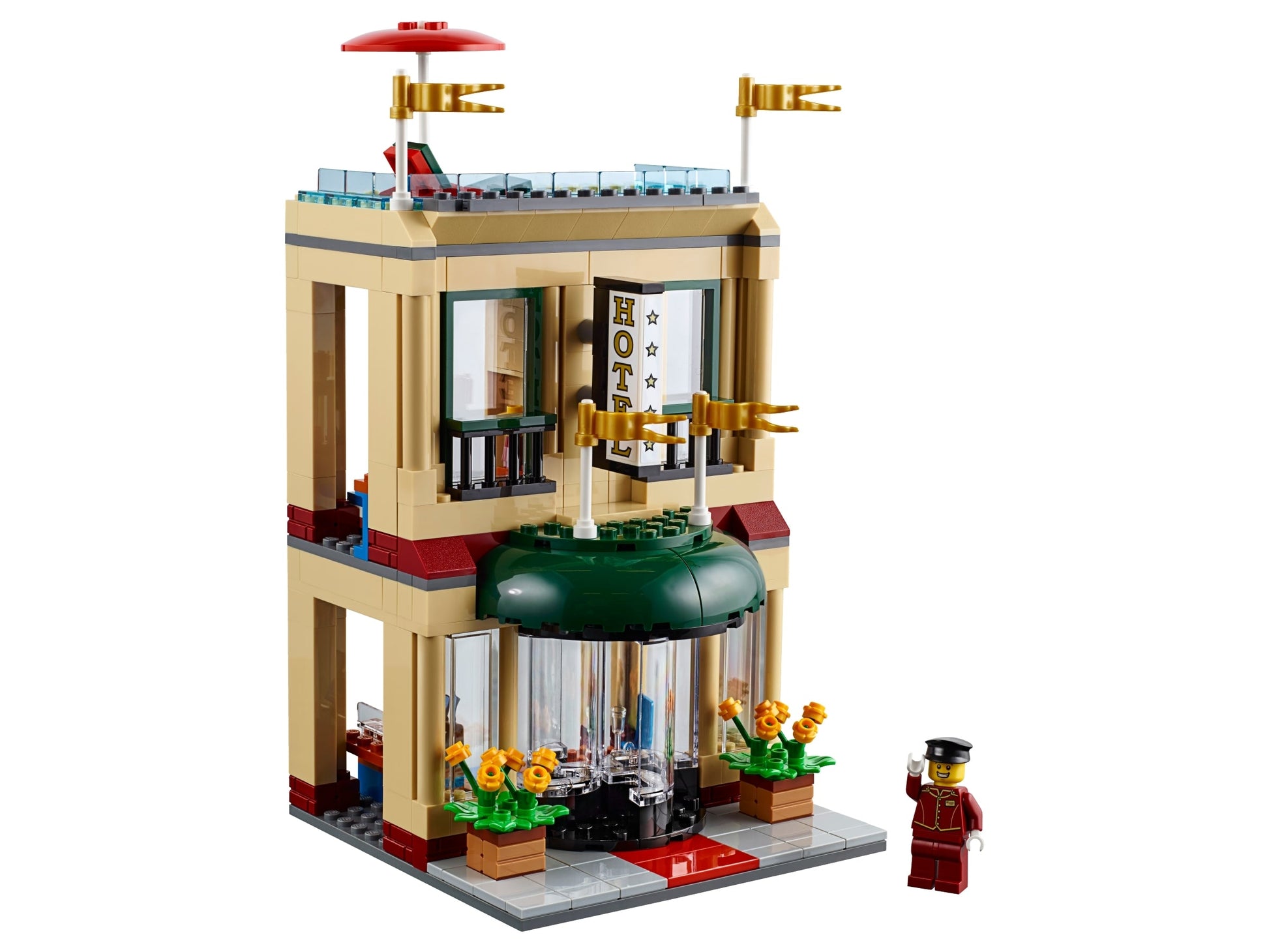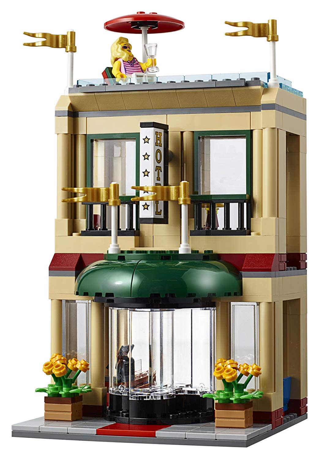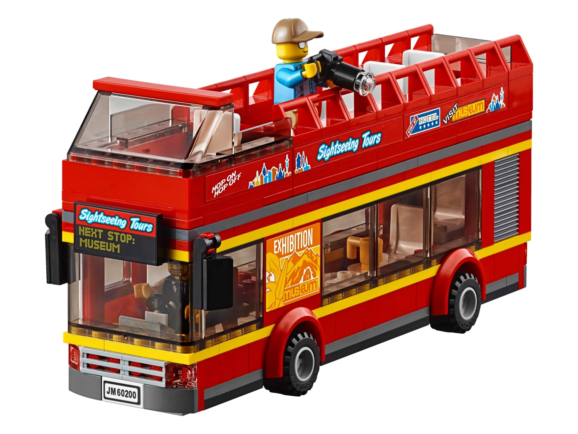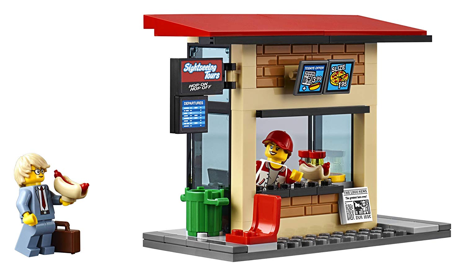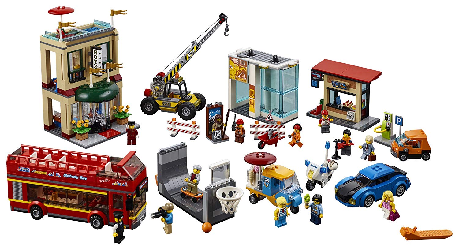 - Includes 13 minifigures: hotel bellhop and customer, ice cream stall and kiosk workers, city bus driver, skateboarder, street musician, traffic cop, 2 construction workers, tourist, businessman and caveman