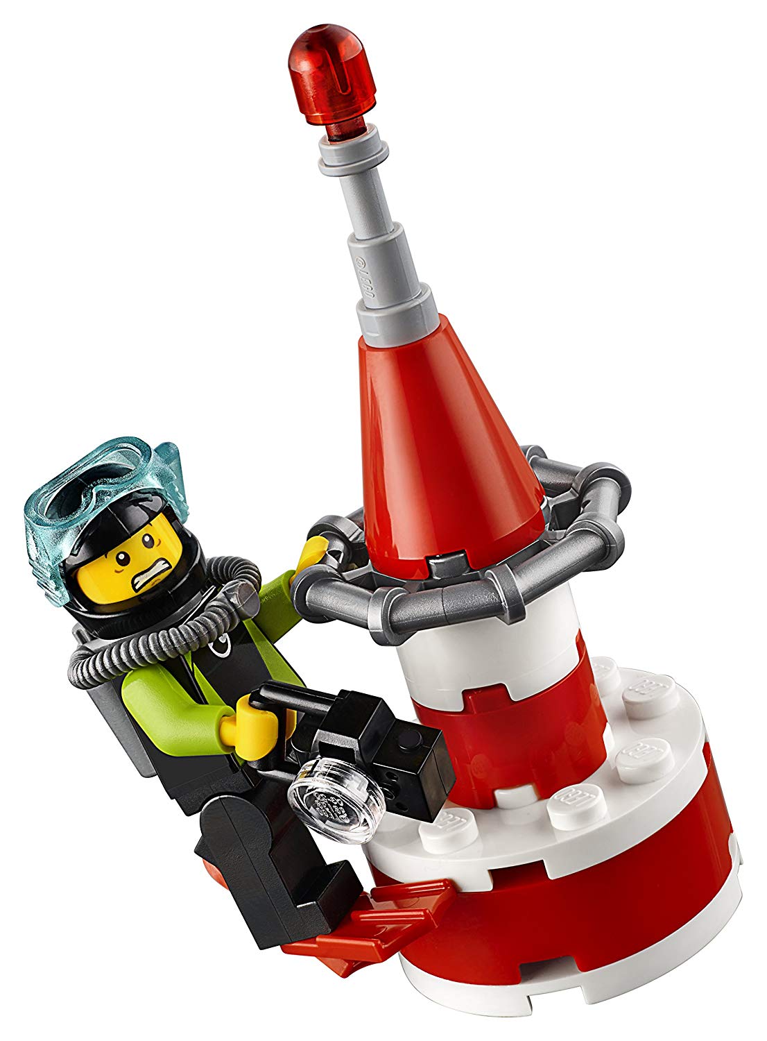 - Includes 3 minifigures: 2 Coast Guard members and 1 diver, plus an octopus figure