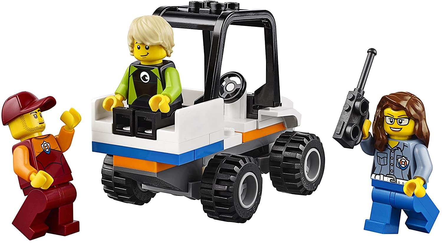 - Includes 3 minifigures: a lifeguard, surfer and an ATV driver, plus a shark figure