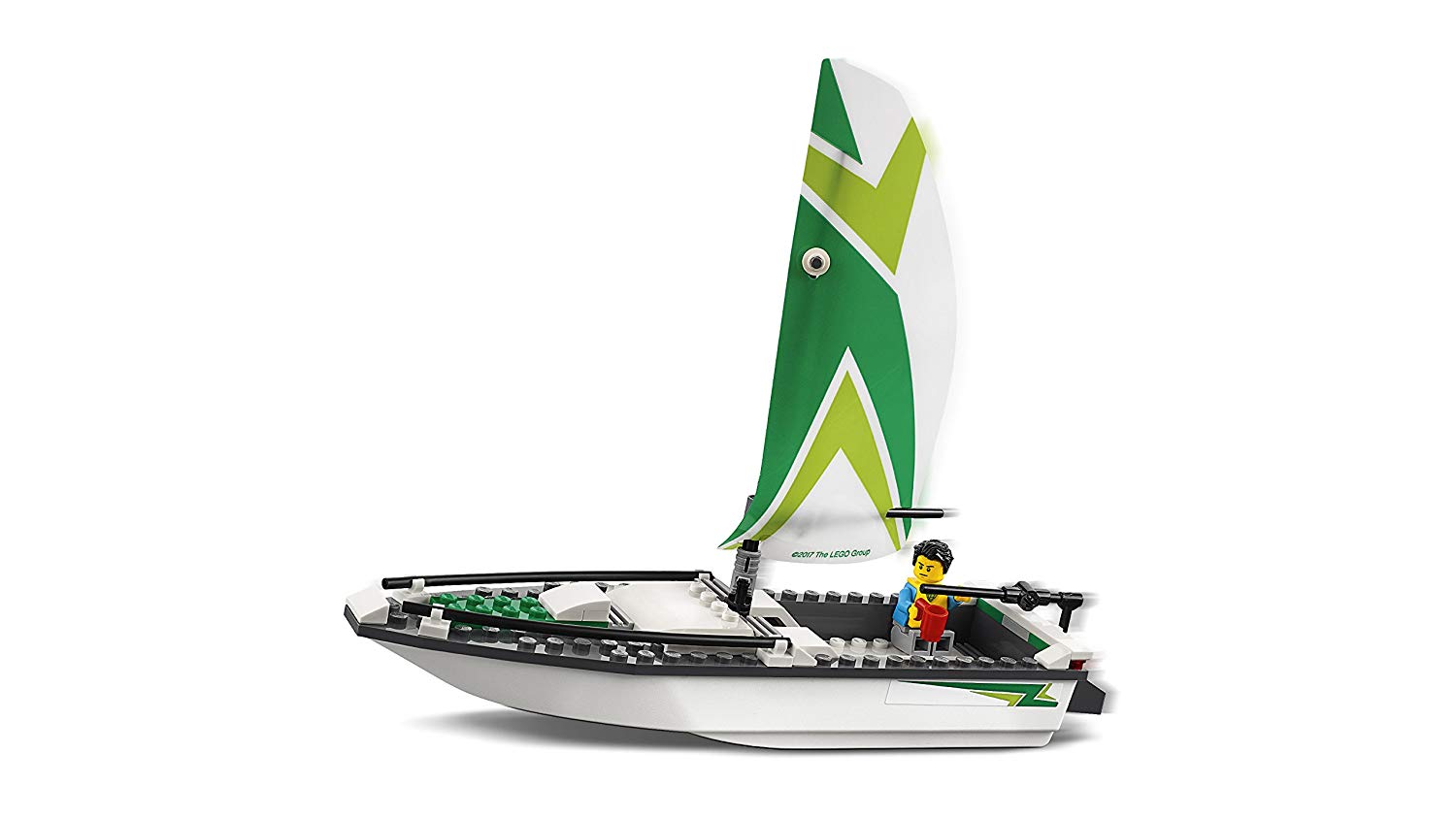 - Features a coast guard rescue craft with drop-down motors and spinning propellers, sailboat with working rudder, and toppling mast and sail, plus a rock island build.