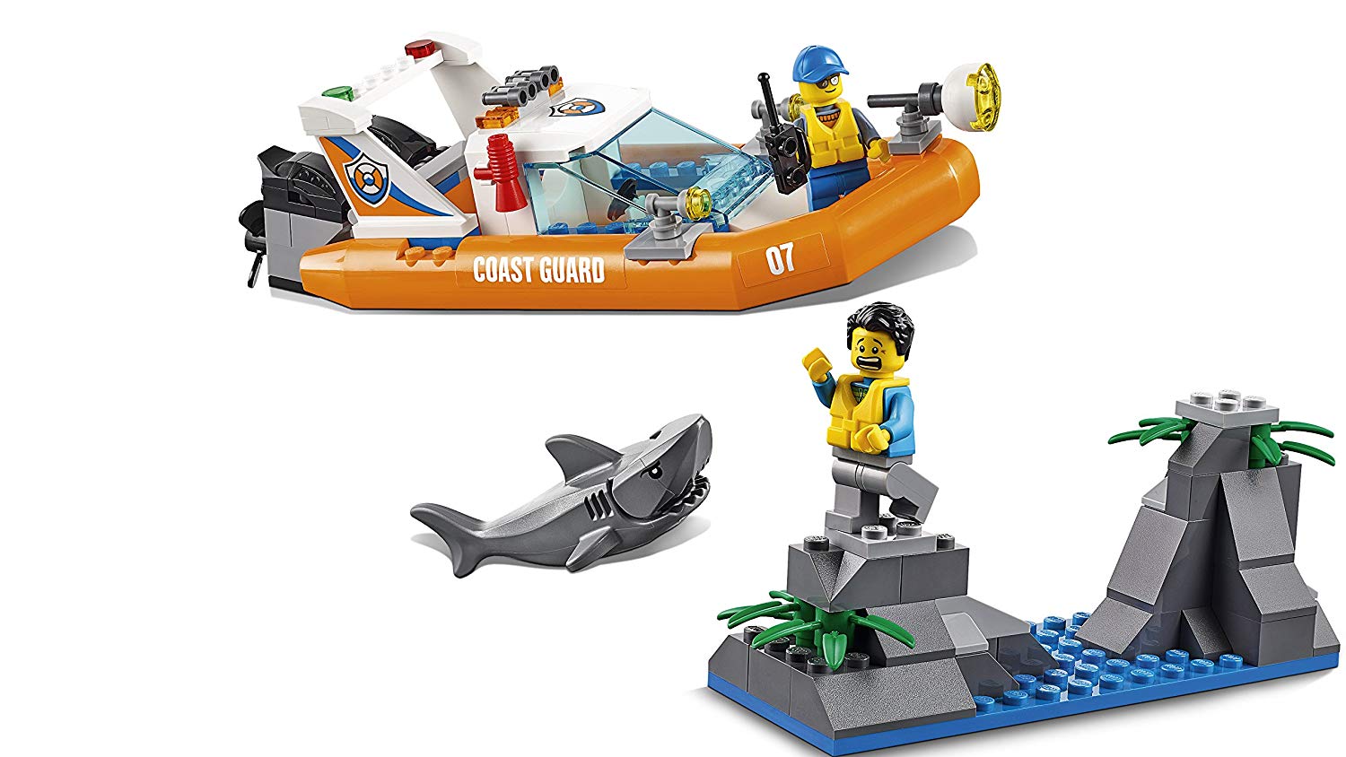 - Includes 2 minifigures: a rescue pilot and a sailor, plus a shark figure.