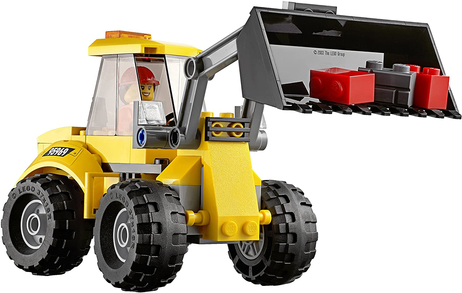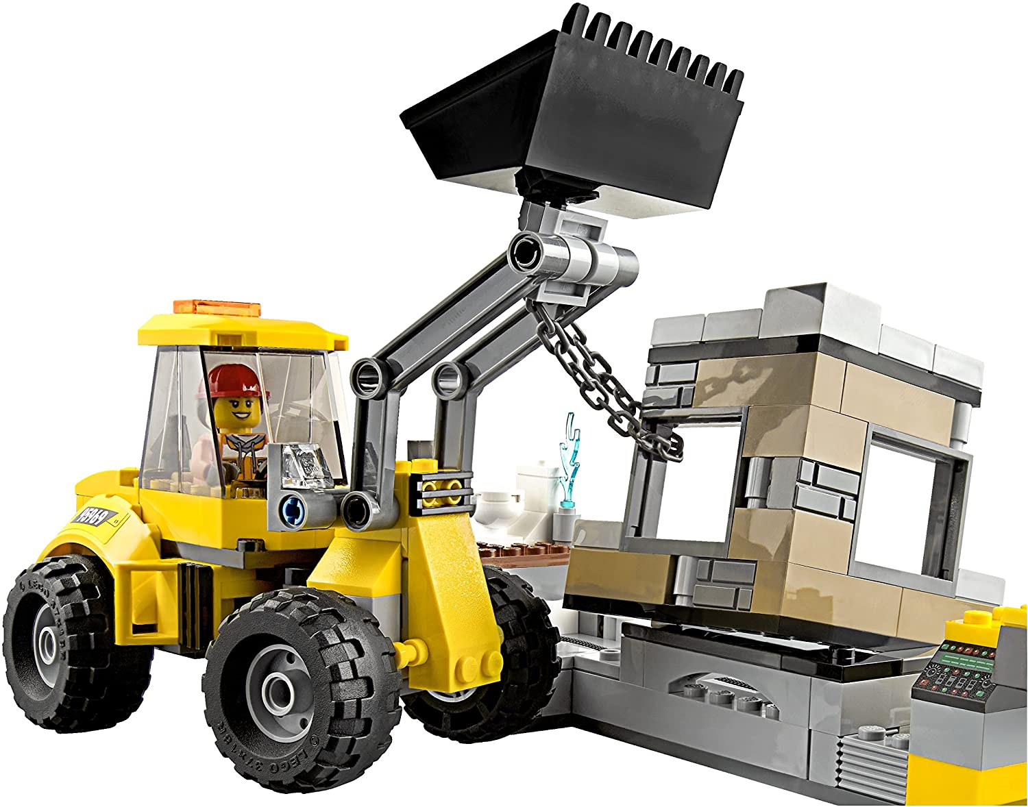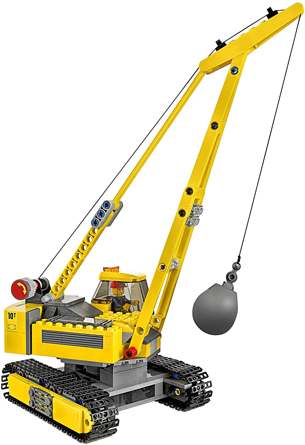 - Features a crane with movable jib and wrecking ball, front-end loader with moving bucket, dump truck with tipping bed
