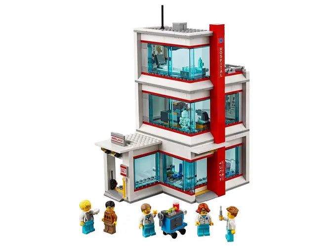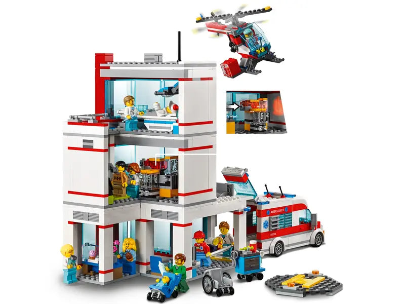 - Build a modular, 3-level hospital including a baby delivery room and an x-ray room with light brick, plus a helicopter and ambulance, with this fun hospital playset.