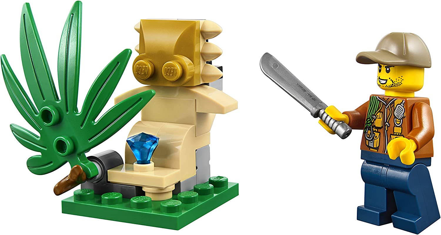 - Go exploring in the wilds of the City jungle with the Jungle Buggy featuring a minifigure cockpit and space in the back for machete and binoculars elements, plus a buildable statue with hidden diamond element, moving leaf and a red spider figure.