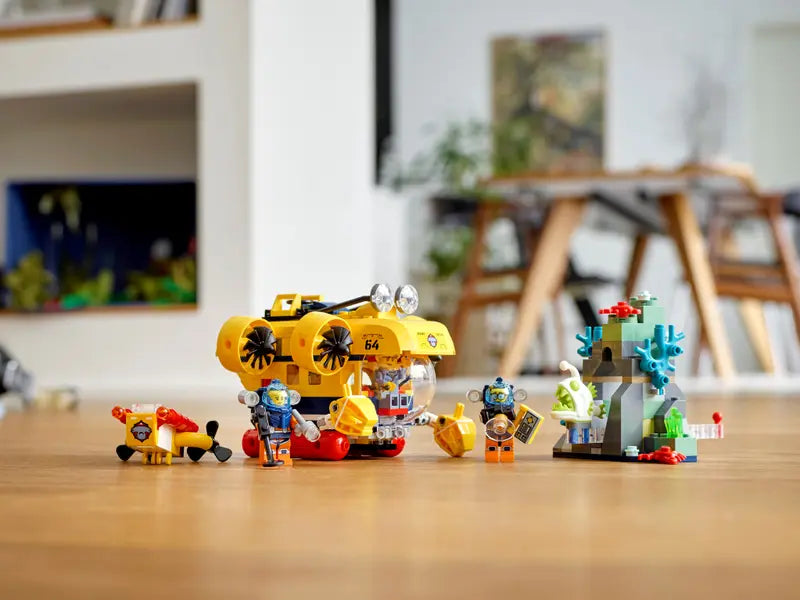 - Building Kit includes a toy submarine, underwater drone and a coral-covered seabed setting, plus 4 minifigures, including City TV's Jessica Sharpe and 2 divers with cool accessories, and a glowing anglerfish figure.