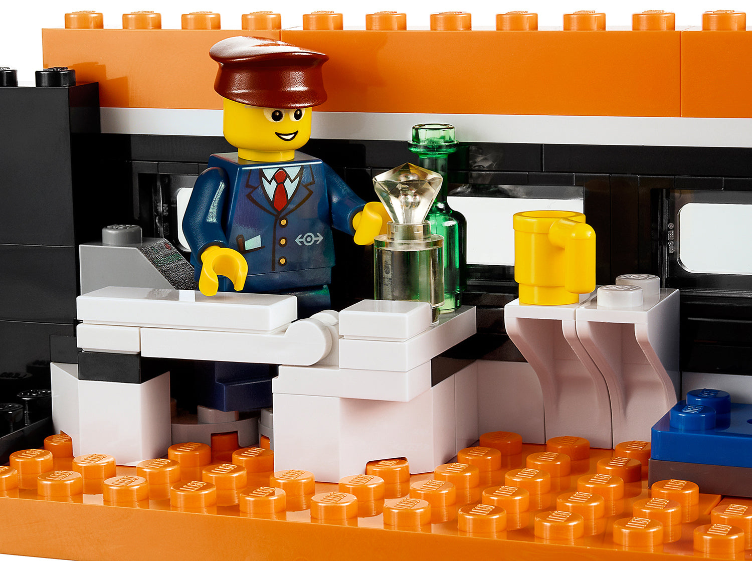 - Features 3 train cars, detailed engine room, printed windscreen, black train windows, brick-built chevron detailing, extendable pantographs, seats, a bathroom with sliding door, bar with hinged counter and tables with seats