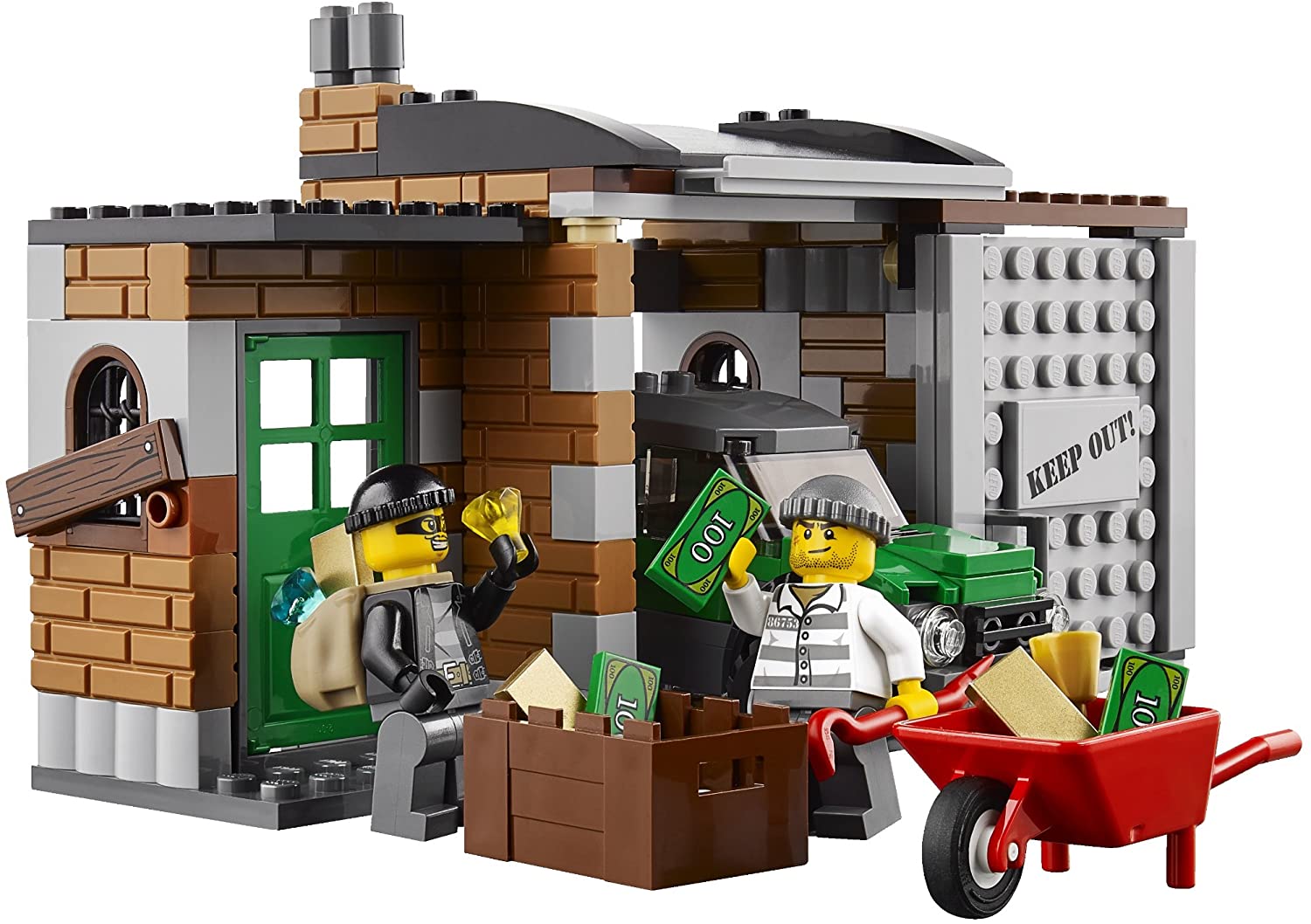 - Includes 3 policemen and 2 crooks with assorted accessories; Features police helicopter, crook hideout, crooks' car and a barrel