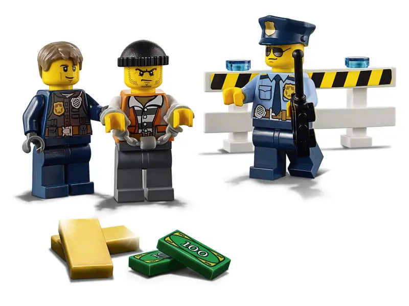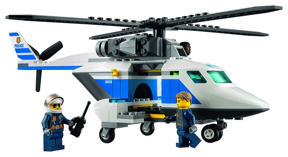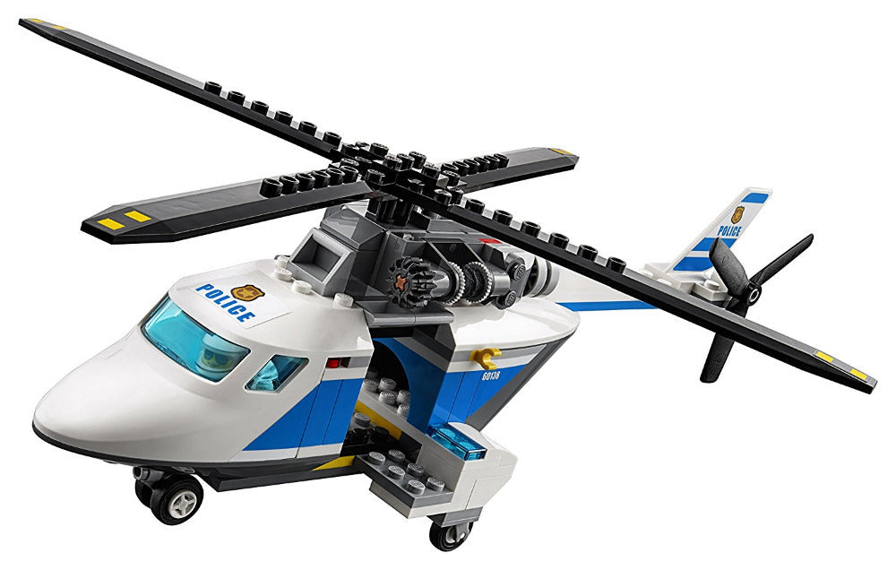 - This set features a police helicopter with spinning rotors and a lowering winch with hook, police pursuit car, stolen sports car and a barrier.