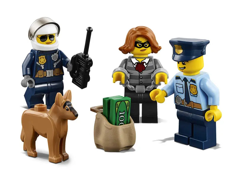 - Includes male and female police officers and male and female crook minifigures, plus police dog figure and accessories.
