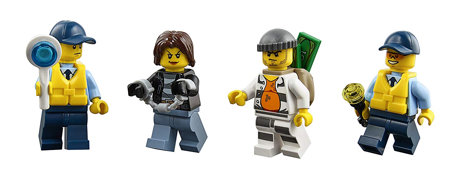- Includes 2 police officers, male crook, and female crook minifigures, plus accessories