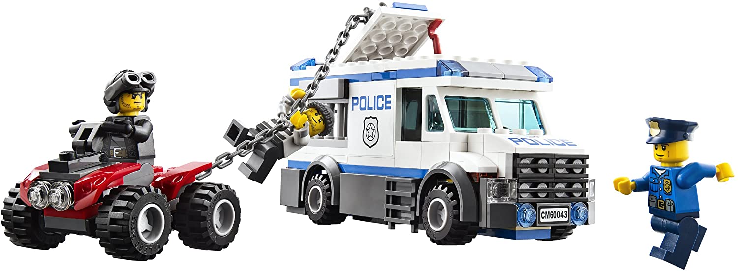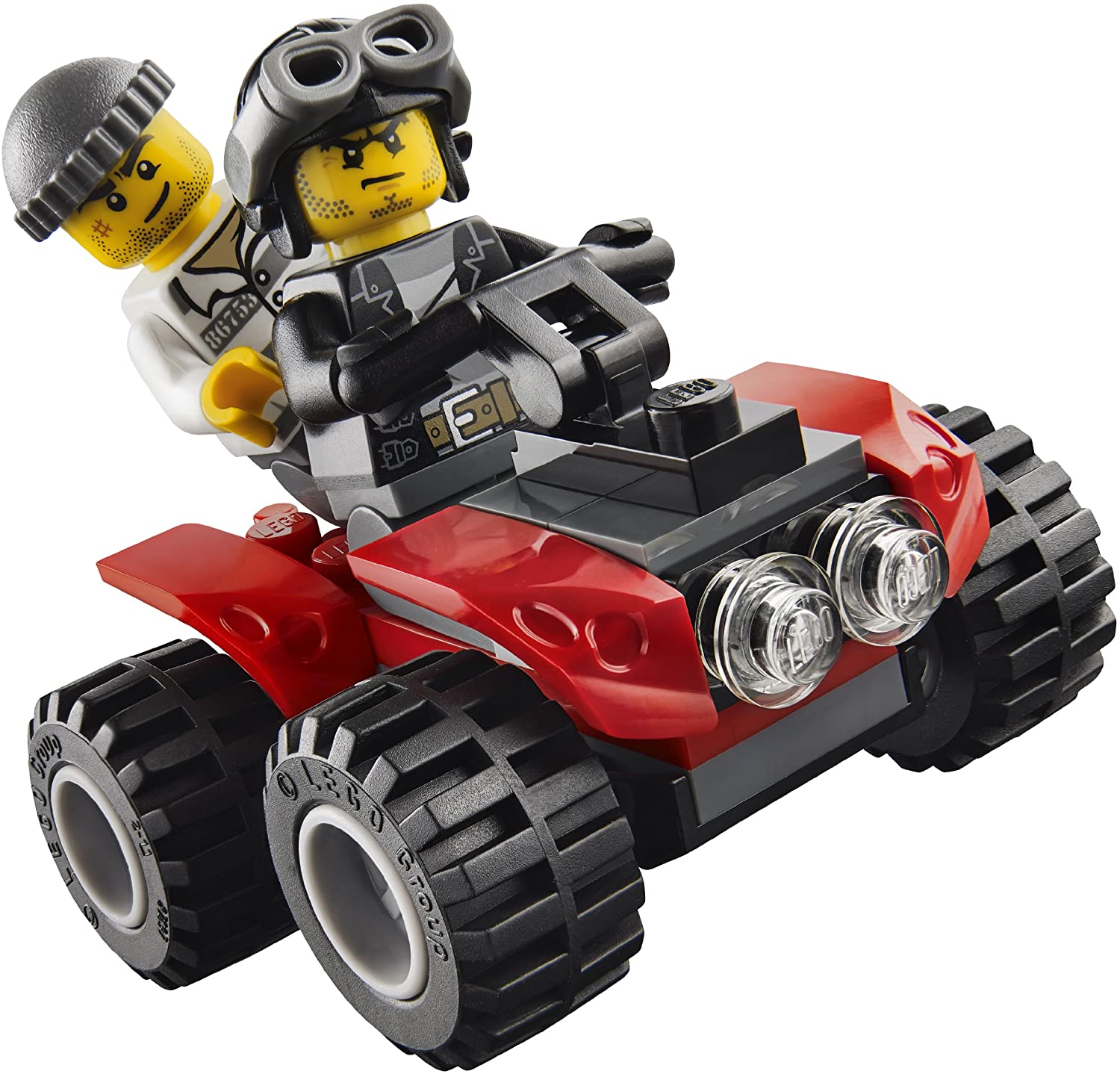 - Includes 3 minifigures with assorted accessories: a policeman and 2 crooks; Features an armored Prisoner Transporter and an ATV.