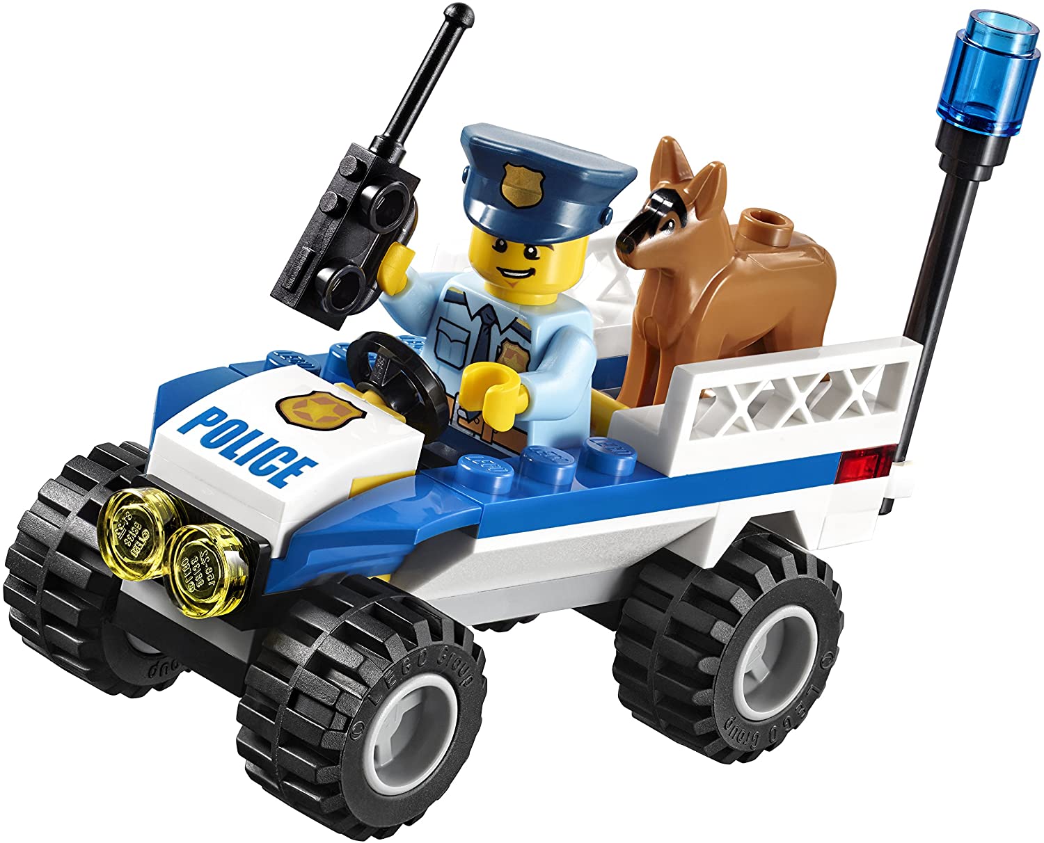 - Includes four minifigures: two police officers and two crooks, plus a police dog figure