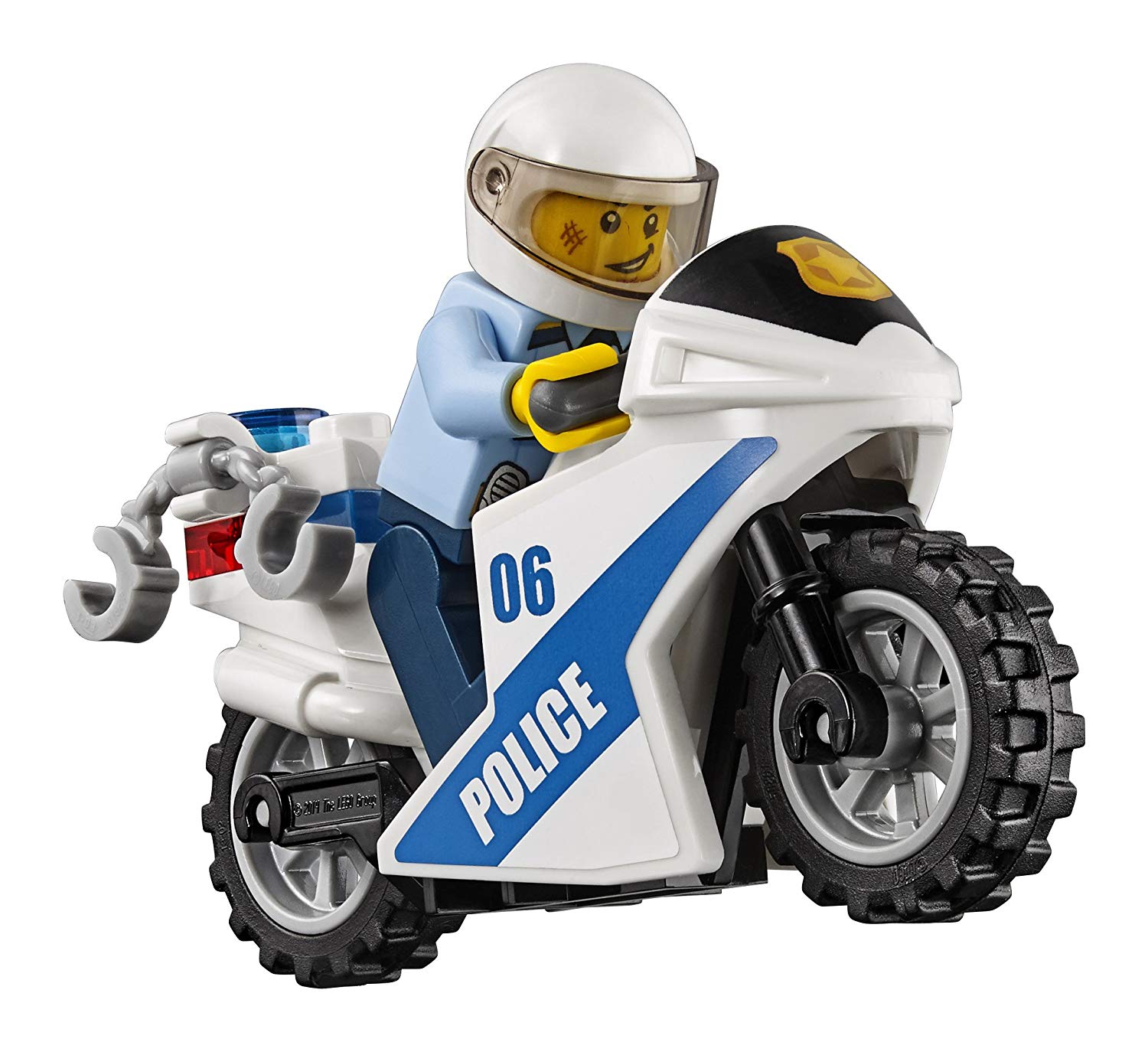 - Be part of the action with the City police as they try to keep the crooks in jail, featuring a 3-level Police Station loaded with accessory elements, a jail cell with exploding wall function, watchtower, garage and offices, helicopter, police pursuit car and police motorbike, plus the crooks’ truck with rotating, extendable cherry picker.