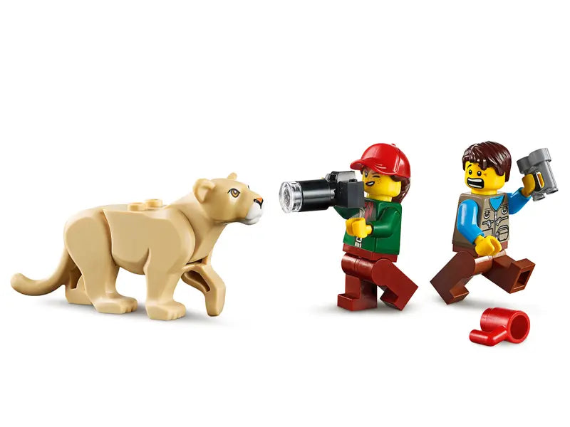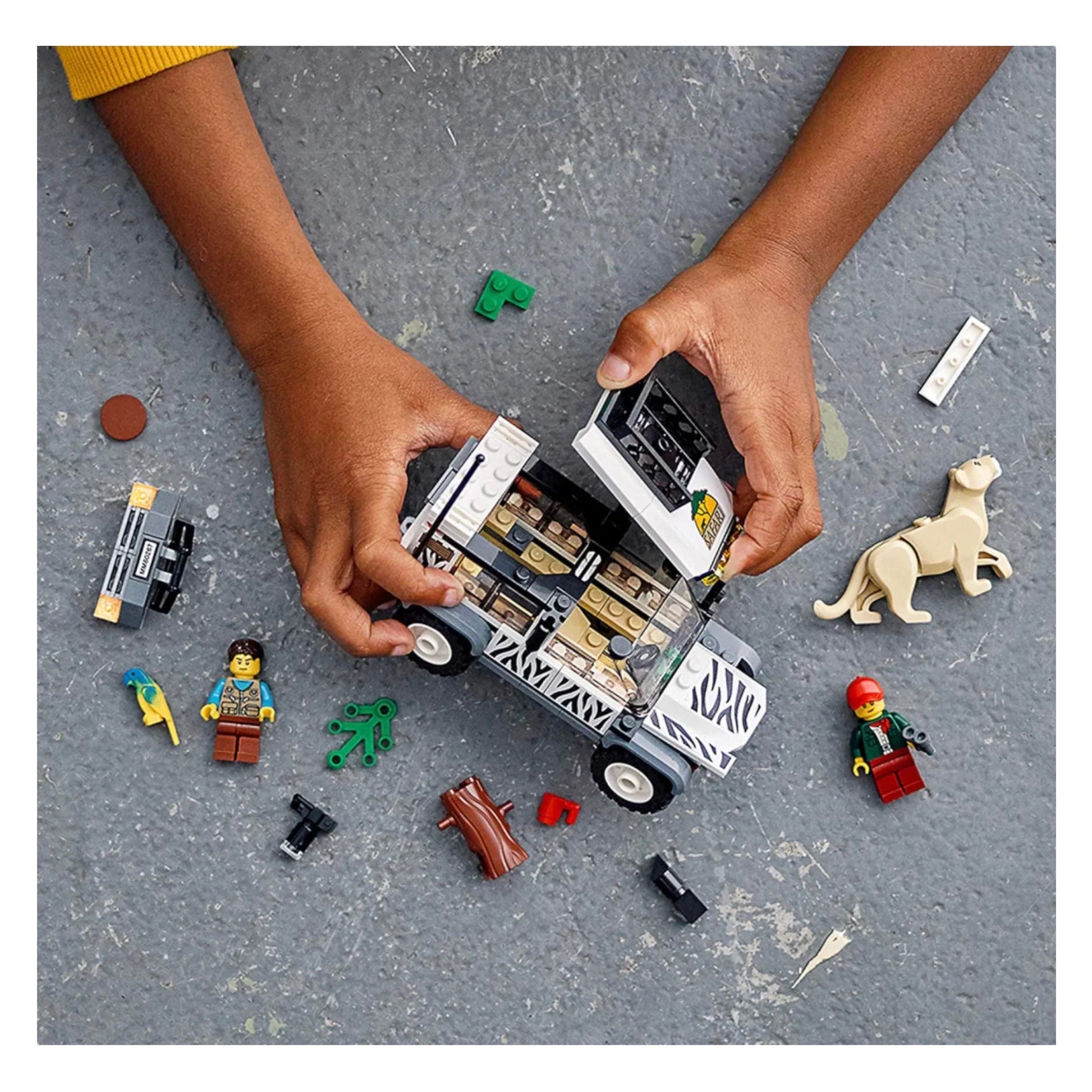 - Comes with everything a kid needs for an action-packed safari, including a zebra-patterned, all-terrain vehicle, a photographer's tree costume, 2 explorer minifigures, and lioness and parrot figures.