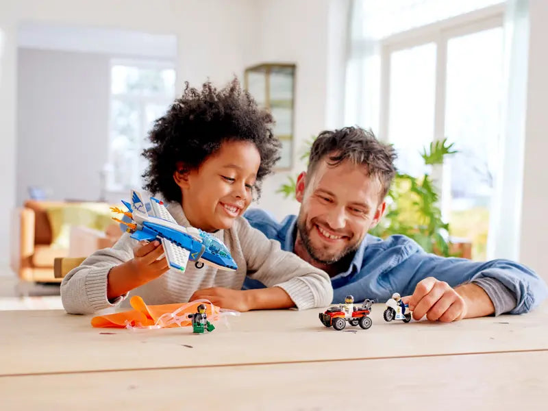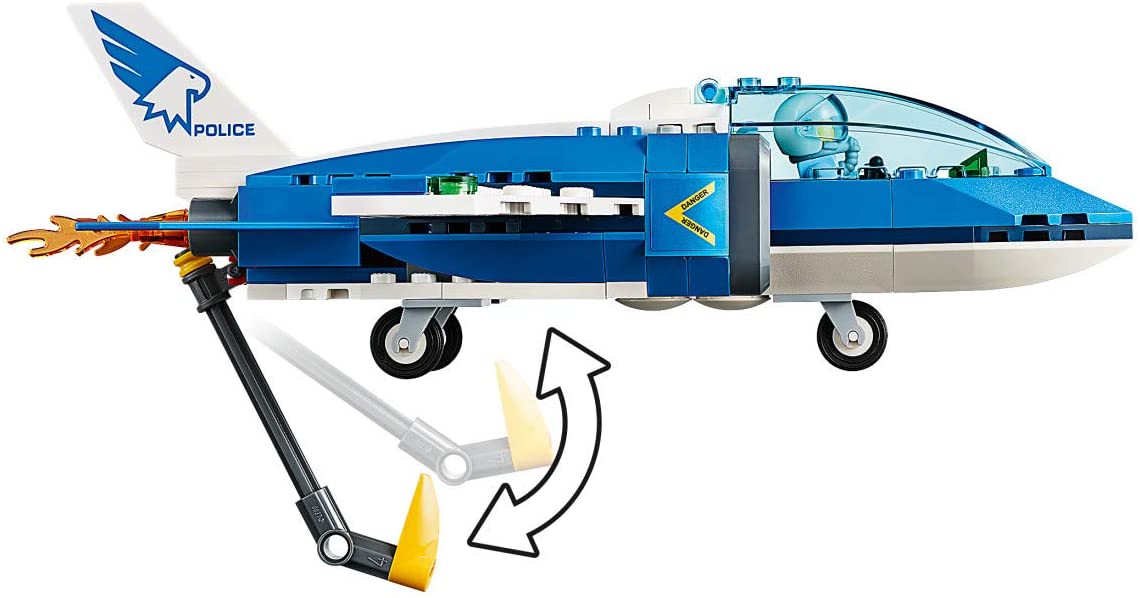 - Build a super-fast Sky Police toy jet plane with opening cockpit and extending hook to catch the crook’s parachute, plus a police motorbike and a crook’s getaway buggy for epic police adventures!