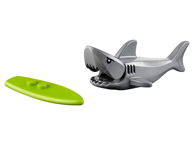 - Includes 3 minifigures: a lifeguard, surfer and an ATV driver, plus a shark figure.
