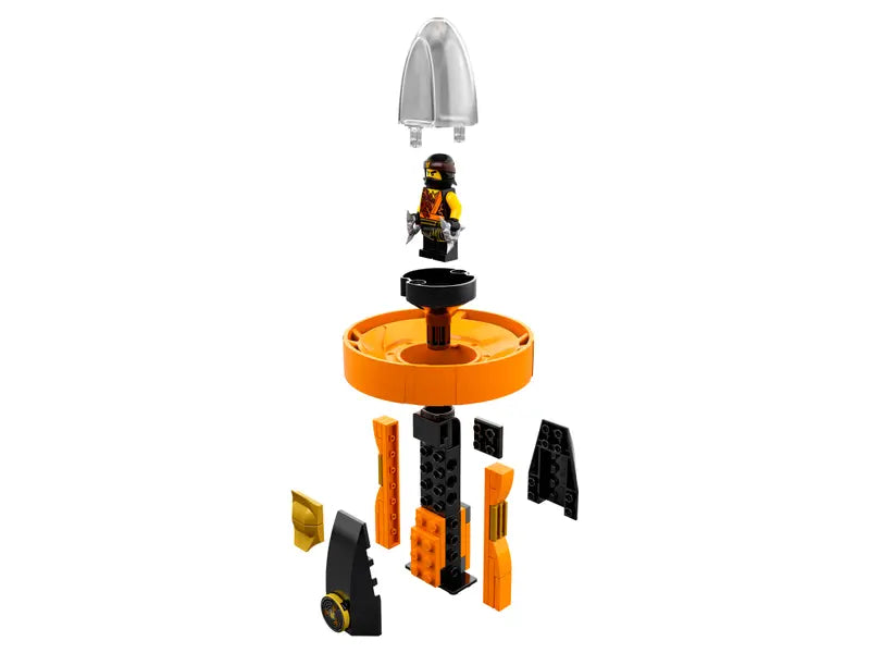 - Features a Spinjitzu spinner with buildable brick handle, spinner element with minifigure capsule and rip cord, weapon rack with a hammer, and Cole’s 2 shurikens.