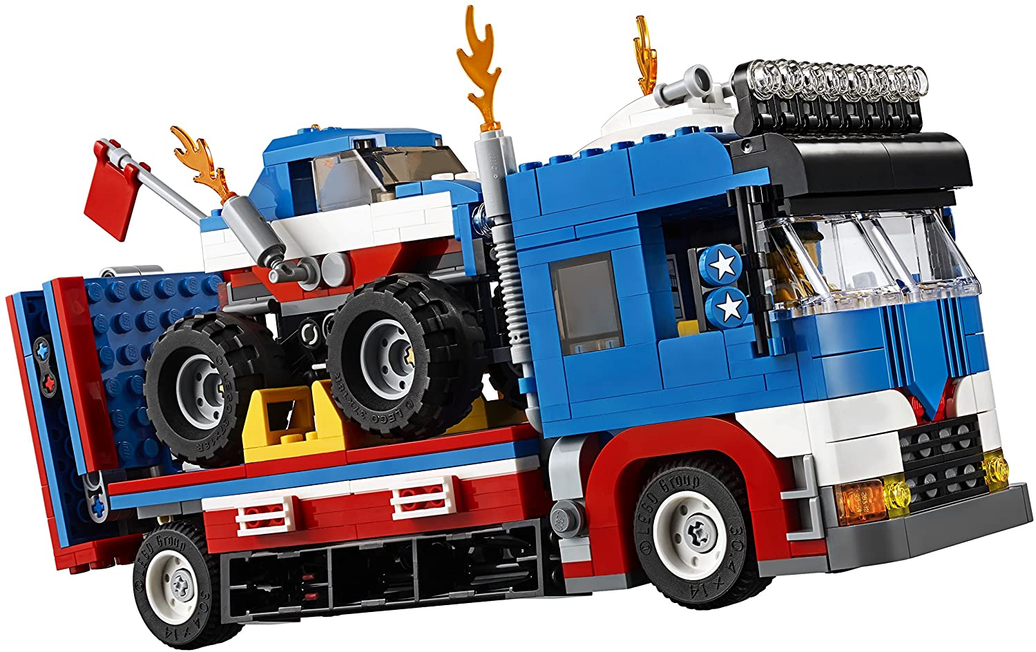 - Build a cool monster truck on a vehicle transporter with folding stunt show ramps and floodlight tower