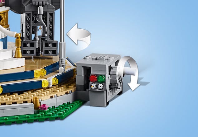 - Build your own Creator Expert Carousel, featuring large textile canopy, 2-level deck and main platform with 5 buildable rides, including a white swan, and 4 moving animals: an elephant, tiger, flamingo and a frog!
