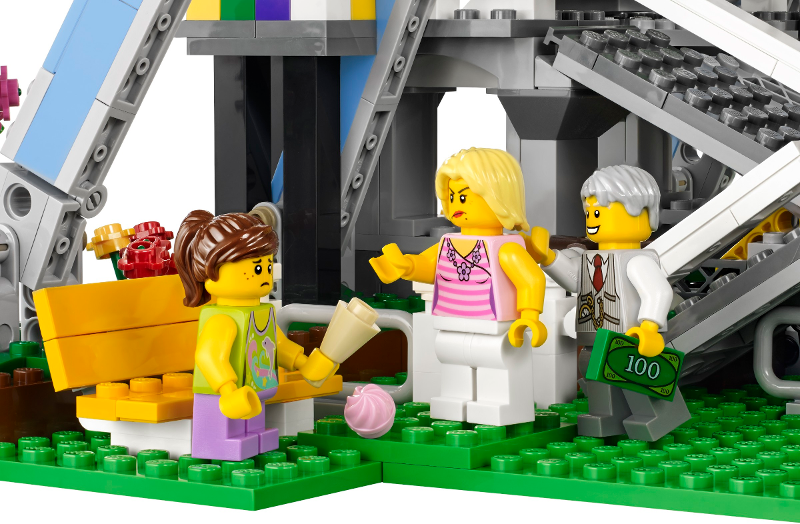 - Includes 10 minifigures: a ride operator, ice cream vendor, 4 children and 4 adults.