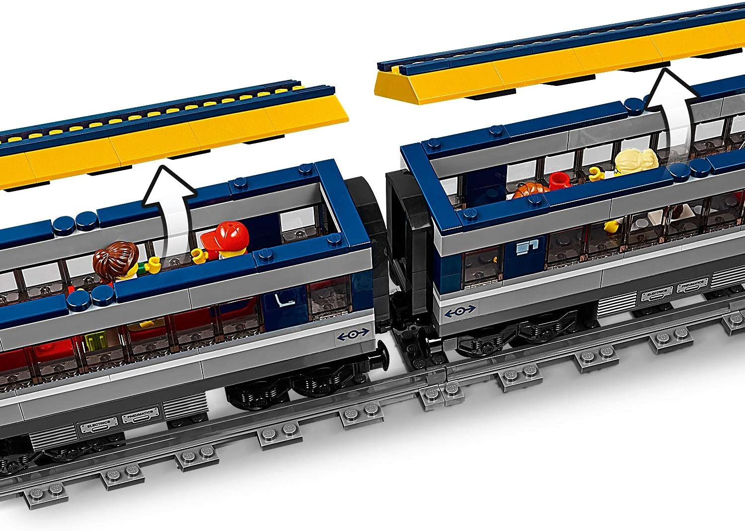- Climb aboard the City Passenger Train! This fun set features a motorized engine with 10-speed Bluetooth remote control and opening nose cone, driver’s cabin with opening window, 2 cars with removable roofs, seats and tables, a full circular track with 16 curved and 4 straight rails, plus a buildable platform with 2 seats and train service map, train signal and 4 minifigures.