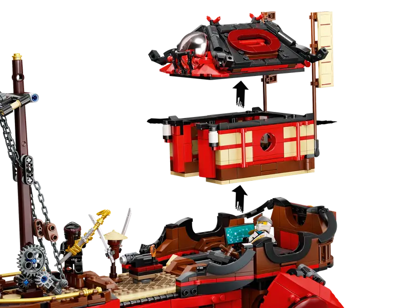 - Kids can remove and unfold upper house for secret ninja training room with golden weapons, to prepare for battle on the ship’s deck.