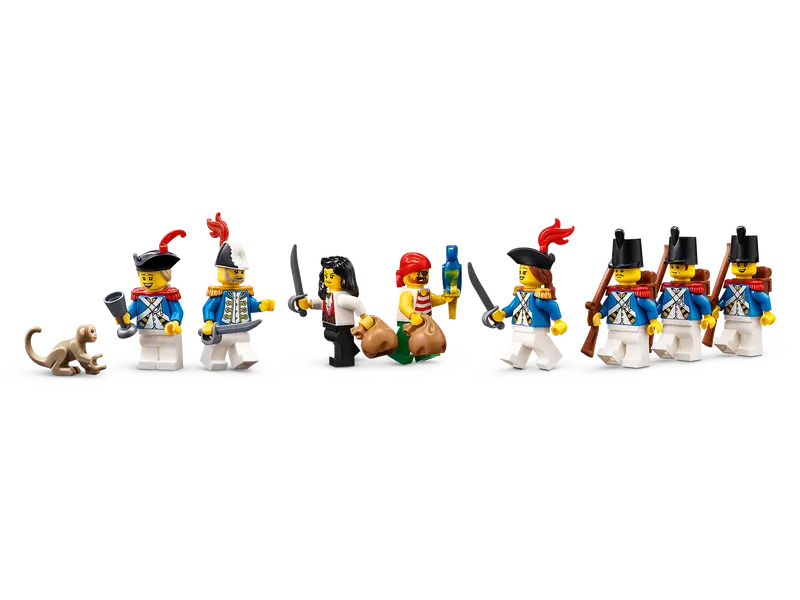 - Minifigure accessories – Includes firing cannons, a treasure map, chests, barrels, sacks, muskets, swords, bowls, goblets, bottles, lanterns, prison keys, a cooking pot, desk, candle and quill pen.