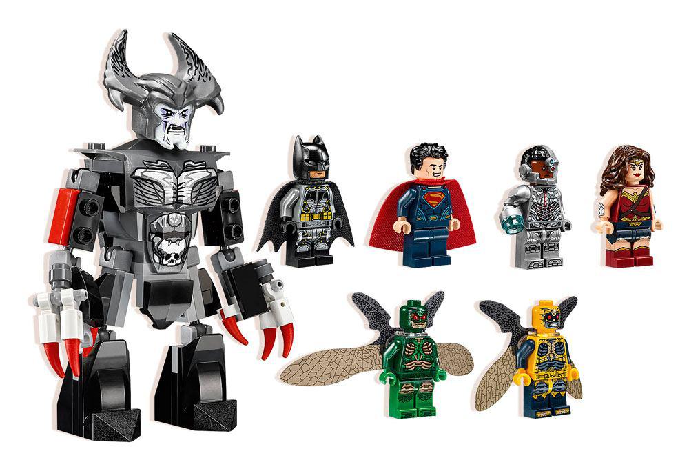 - Accessory elements include Wonder Woman's shield and the Parademons' foil wings.