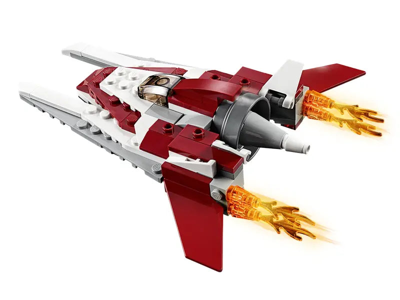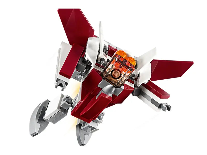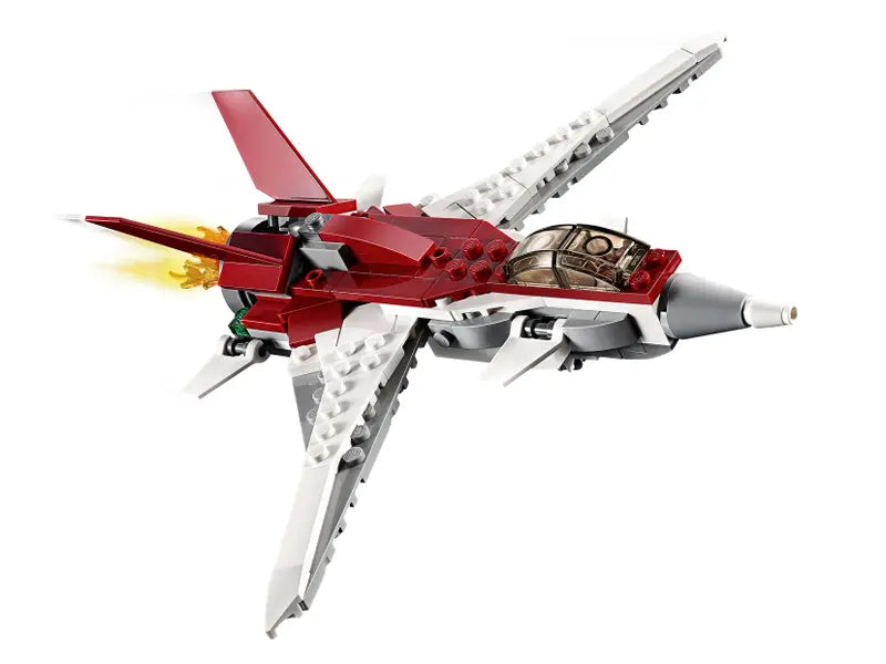 - Get set for supersonic fun with the Creator 3in1 Futuristic Flyer, featuring an awesome dark red and white color scheme, forward swept wings, tinted cockpit, fixed landing gear and a flaming jet engine.