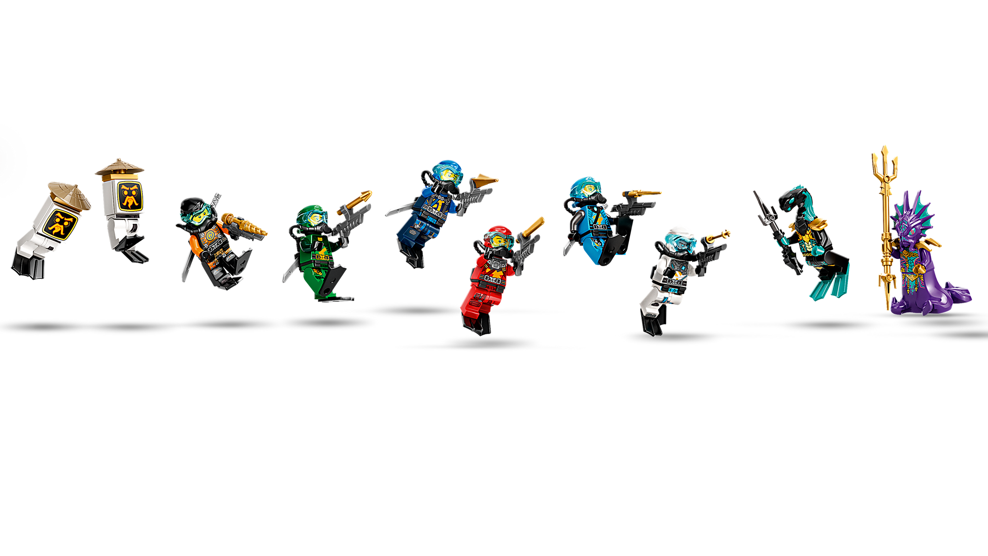 - Includes 10 minifigures from the Seabound TV series: Scuba Kai, Scuba Cole, Scuba Jay, Scuba Lloyd, Scuba Zane and Scuba Nya.