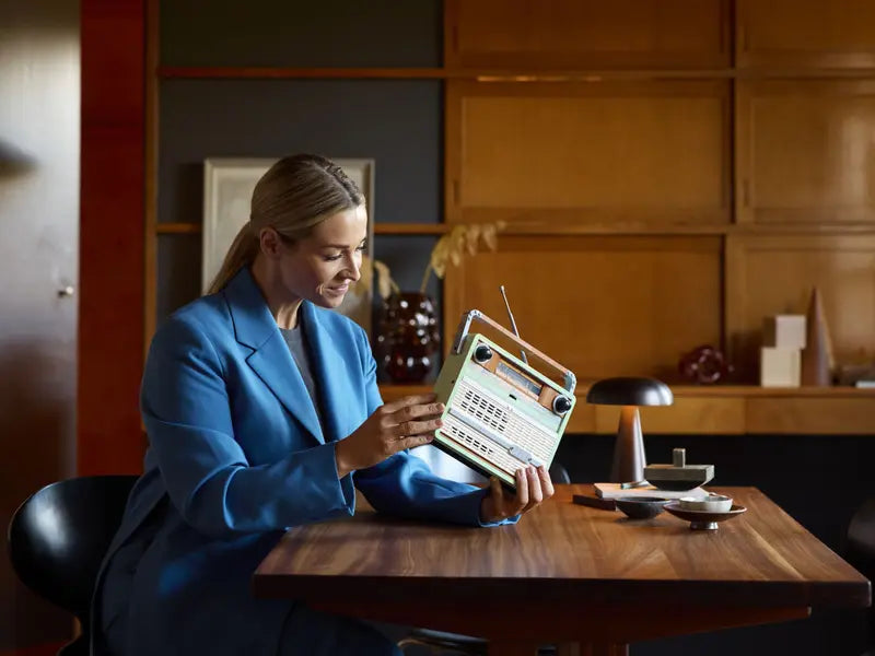 - ornamental replica of a vintage radio complete with a fold-up handle, antenna, and a sliding frequency switch. And thanks to a smart sound brick, you can rotate the classic power and tuning dials to emit signals and music snippets. If you want to take it even further, you can mount a smartphone in the rear compartment to enjoy your favorite tunes as if they were being beamed in from your local radio station.