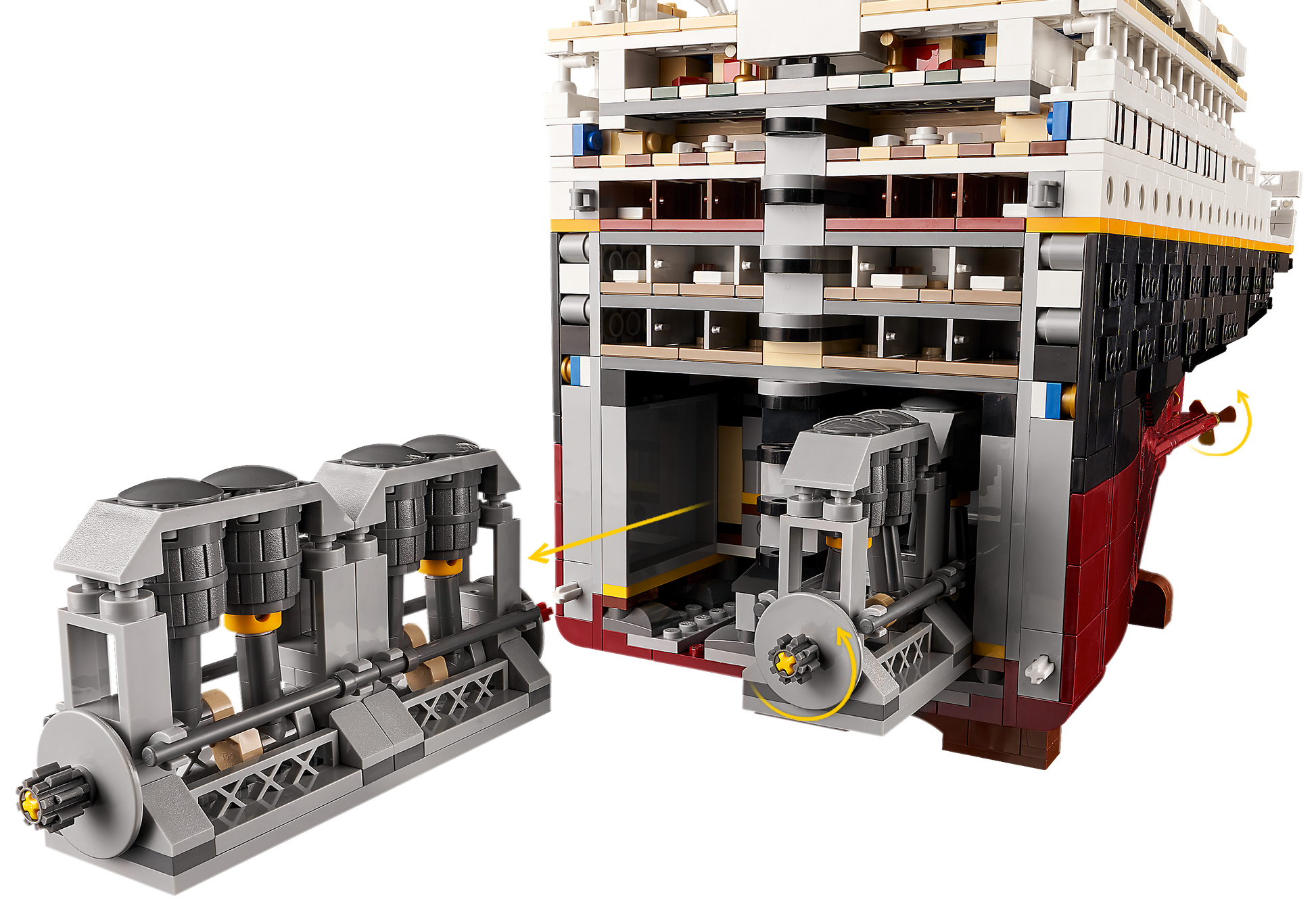 - The * splits into 3 sections, giving a view of the detailed interior. Assemble and admire the grand staircase, cabins, dining room, smoking lounge, reading lounge and swimming pool.