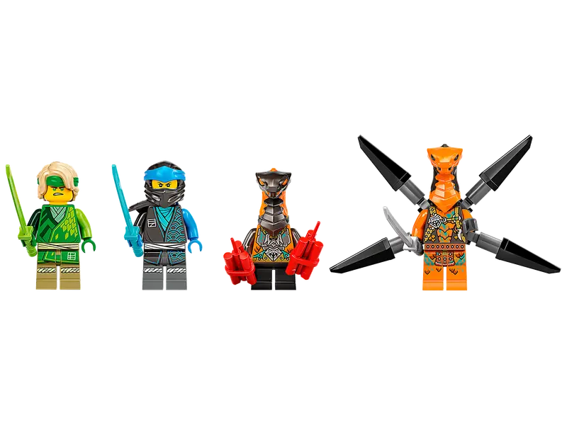 - Includes 4 NINJAGO minifigures: Lloyd with a sword, who can be upgraded with a hood, Nya with a spear, and 2 NINJAGO snake warriors.