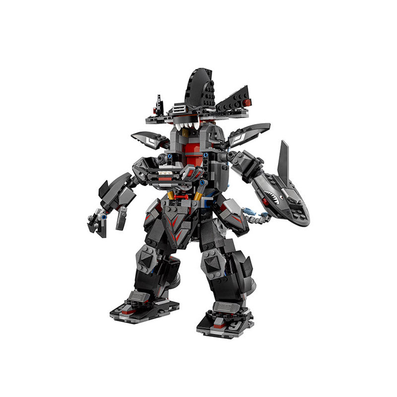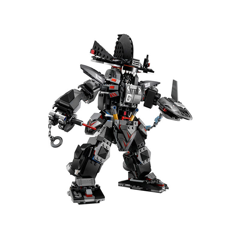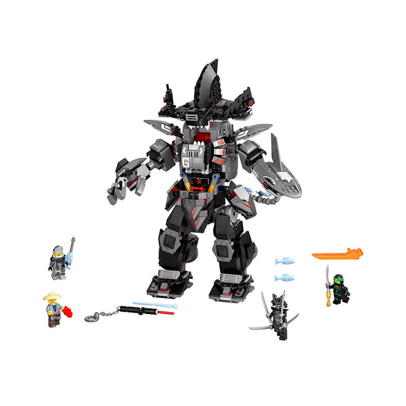 - Garma Mecha Man features an opening minifigure cockpit, posable head, arms and legs, spring-loaded shark blaster, ammo belt with shark-shaped ammo elements, and an opening translucent-blue fish tank with mini-shark elements