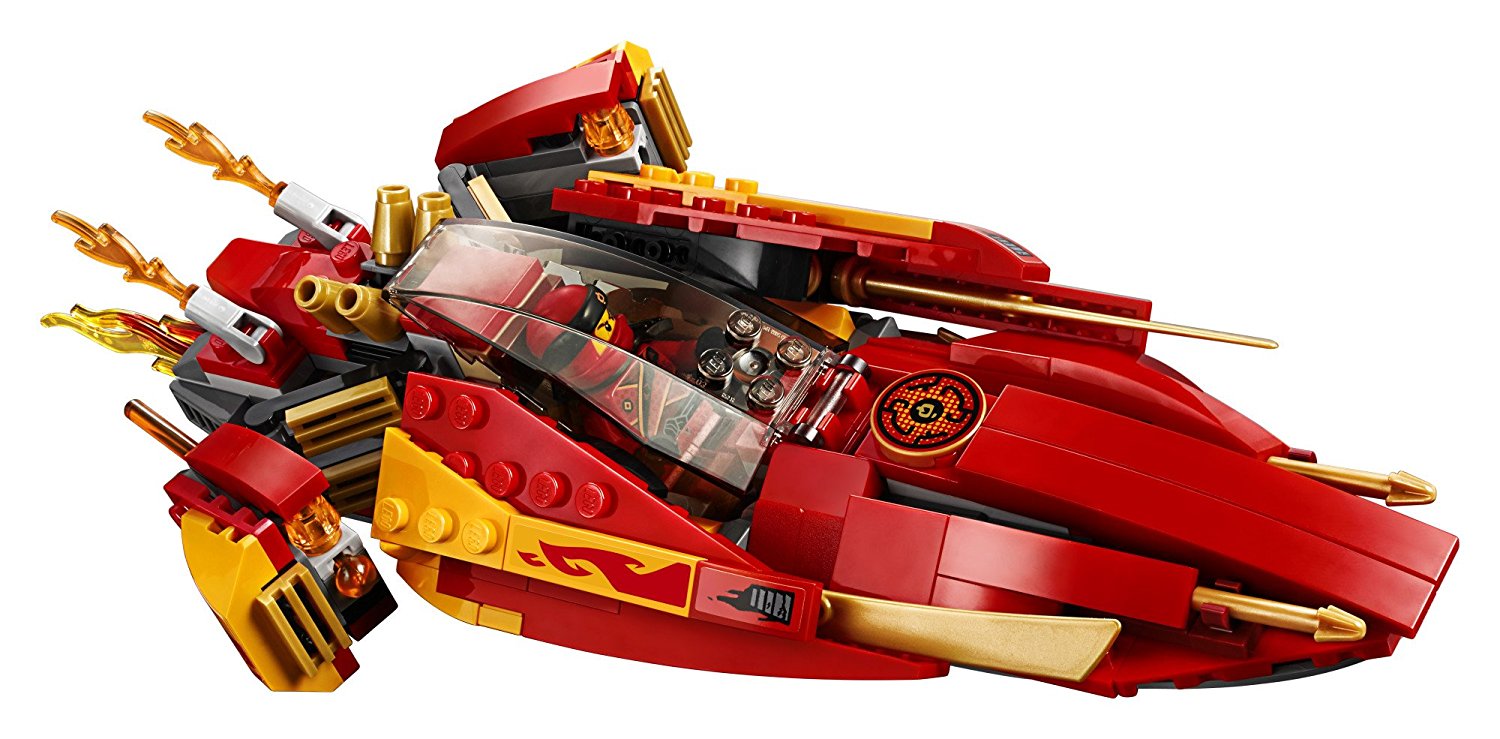 - Katana V11 features speed and attack modes, opening minifigure cockpit, foldout boosters, 2 hidden spring-loaded shooters, opening storage compartment, gold-colored Ninja blades, and exhaust elements.