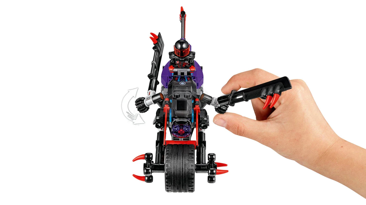 - Oni Bike features a minifigure seat, 2 chopping blades with spikes, 2 stud shooters, front wheel with spikes, 2 detachable swords and a ‘Sons of Garmadon' flag element.