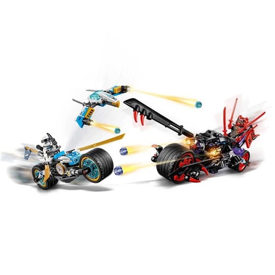 - Titanium Ninja Zane’s bike features 2 foldout gold-colored blades, 2 hidden stud shooters on a foldout detachable drone for ground-level or aerial attacks, while the Oni Bike is armed with chopping blades and 2 stud shooters.