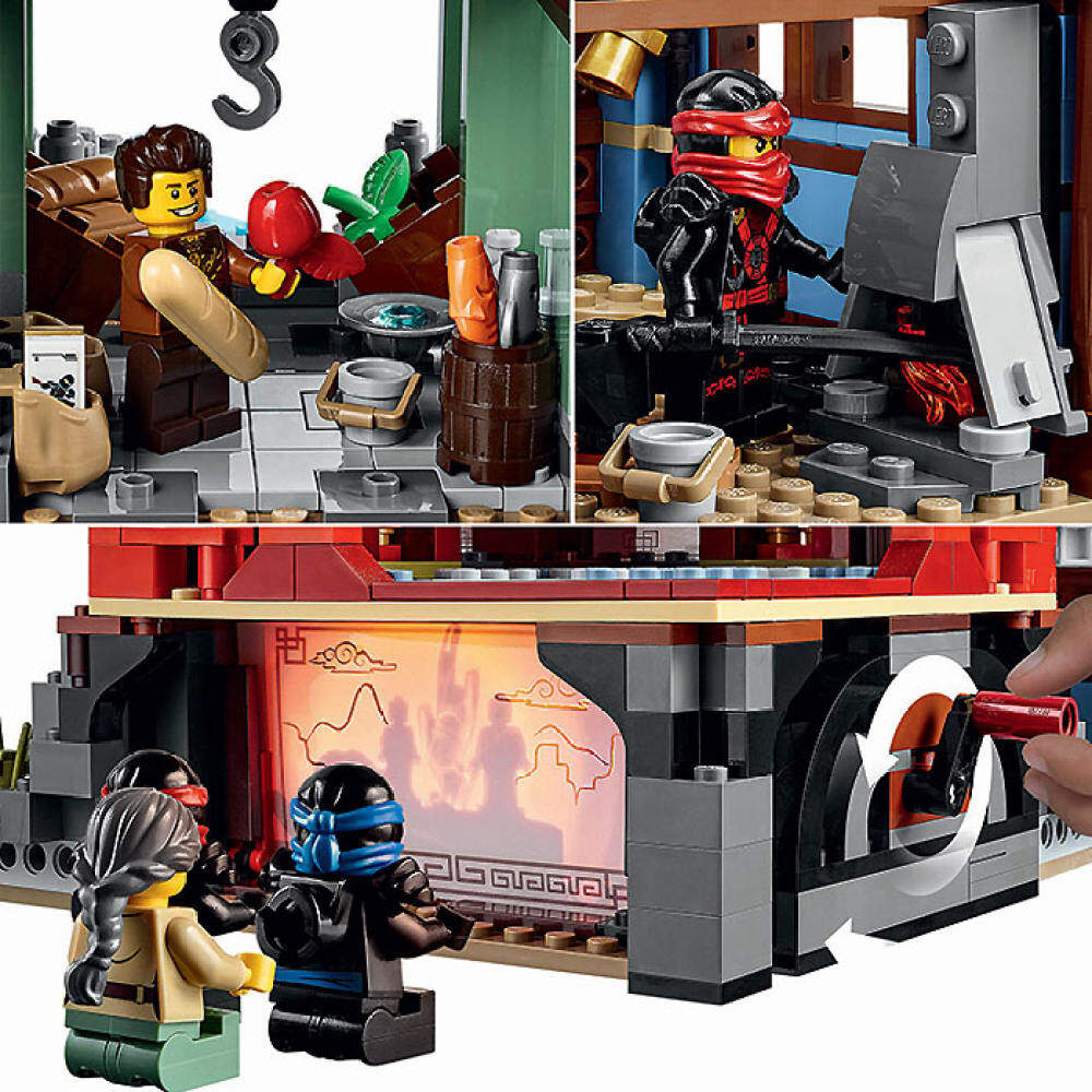 - Smugglers' Market features curved Oriental-style roof, golden Oriental details, 2 hidden treasure chests filled with golden weapons, signs with bread image and fish image, plus assorted elements including barrel with 2 fish, 2 fishing rods.