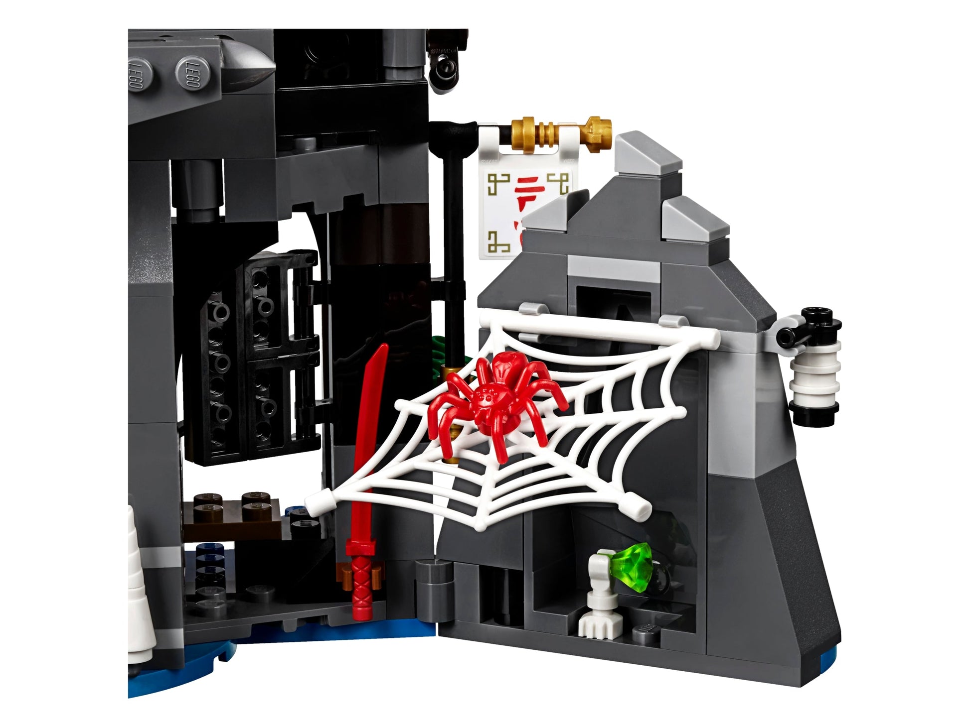 - Lower level has blue water-style baseplates, reed elements, an entrance gangway, opening walls, buildable skeleton, opening minifigure-sized spider prison with spider element.
