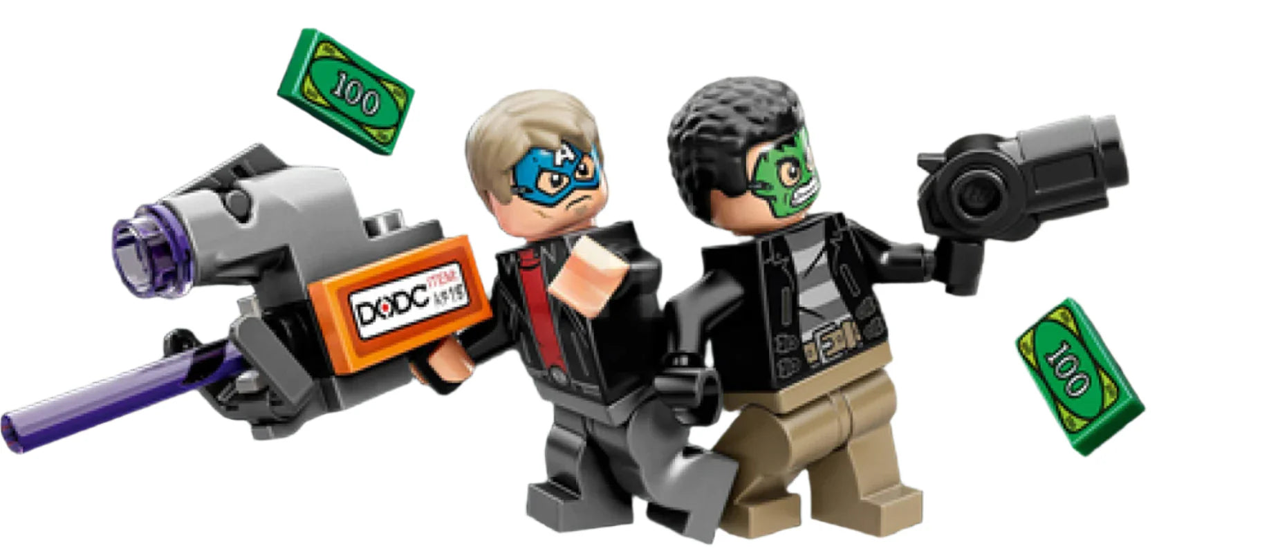 - The crook mini figures each have face mask decoration—of Hulk and Captain America.