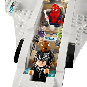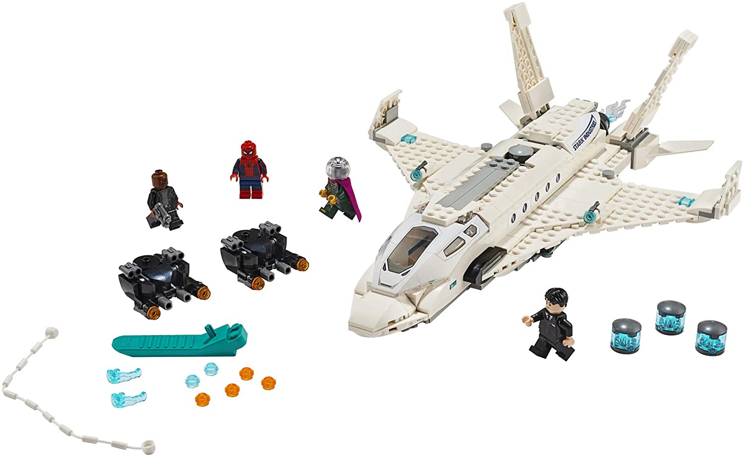 - This action-packed Spider-Man playset features a buildable Stark Jet airplane model toy with 2 stud shooters, adjustable wings, energy bomb storage compartment, dual minifigure cockpit with a rear passenger seat for Spider-Man and an opening hatch function.