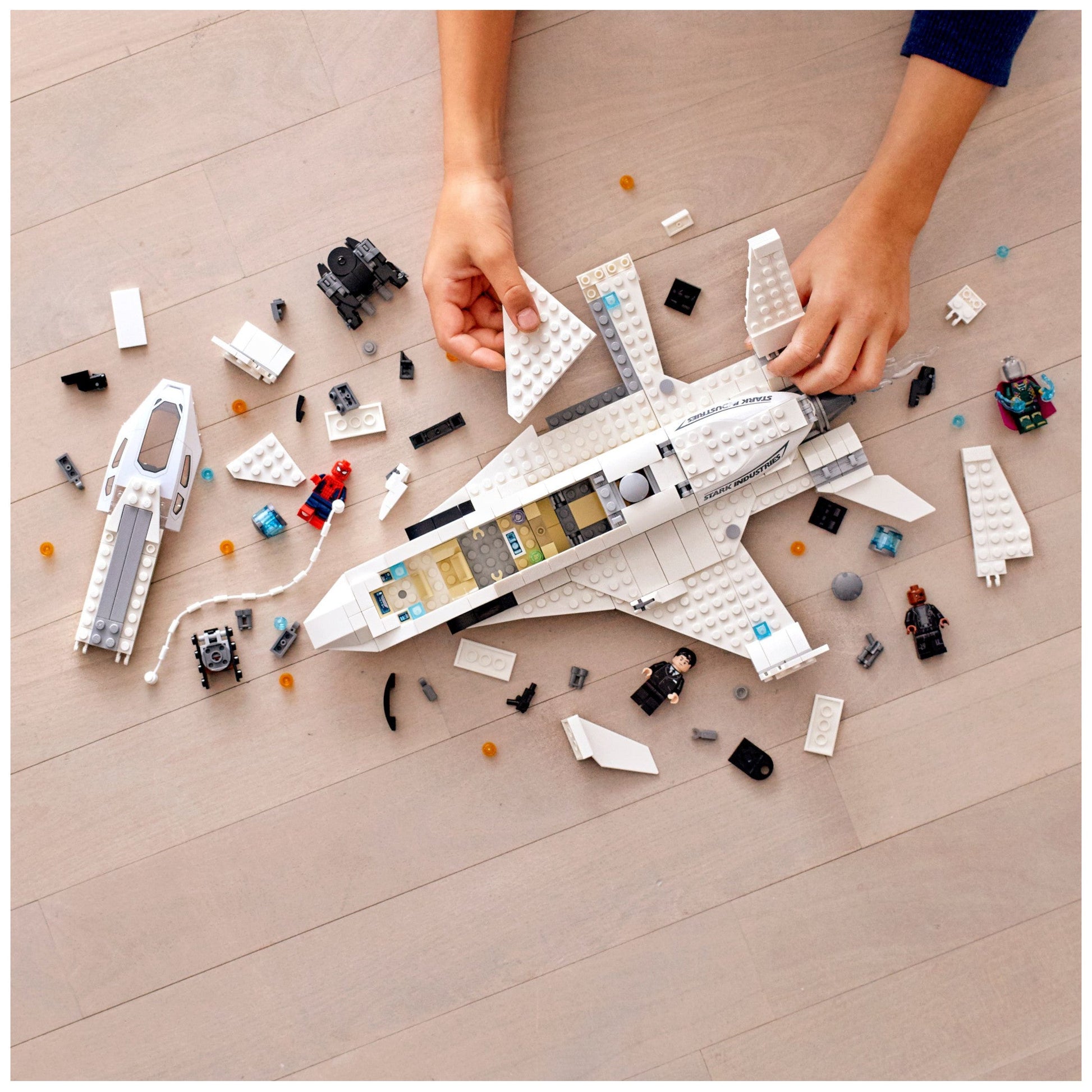 - This creative building toy also includes 2 stud-shooting drones and 4 minifigures to role-play superhero scenes from Marvel’s Spider-Man: Far From Home movie.