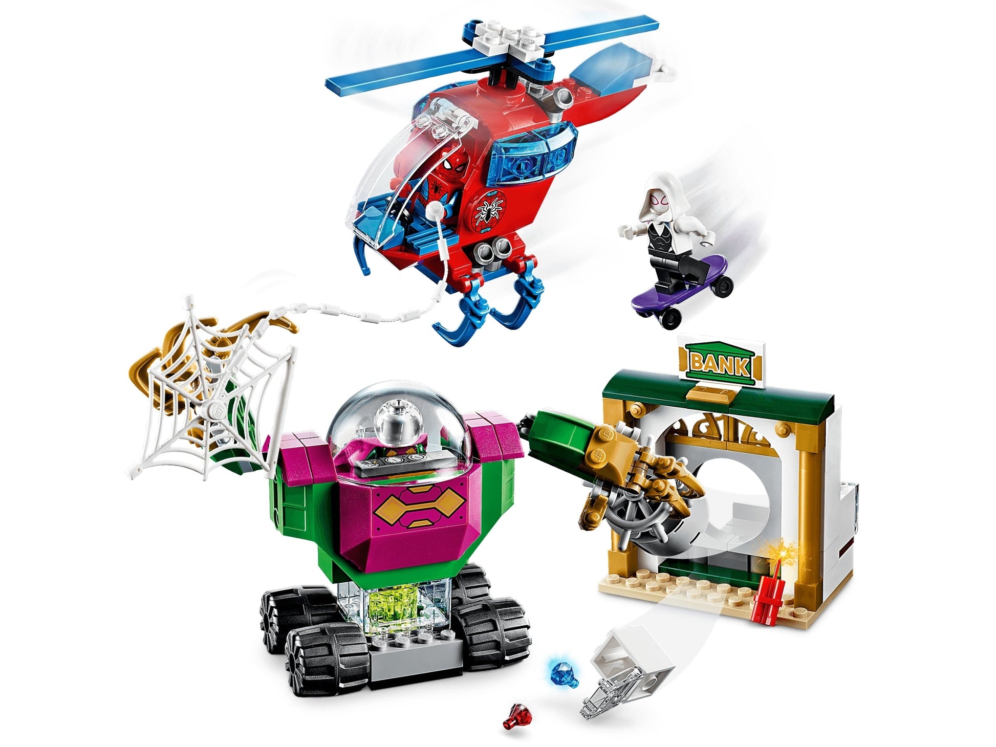 - This cool action-packed toy comes with Spider-Man, Ghost Spider and a new Mysterio minifigure, plus Spider-Man's helicopter, Mysterio's mech, and a bank that breaks open to reveal a toy vault!