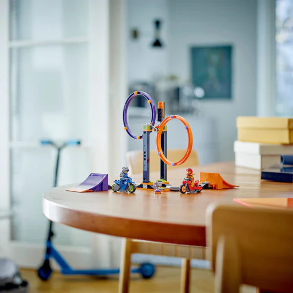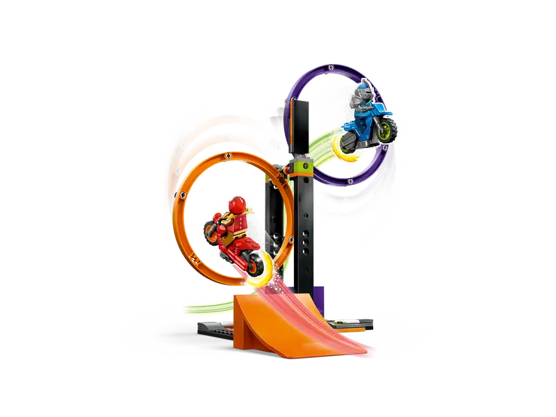 - Spinning Double Jump - This City Stuntz set features a spinning double jump ring, 2 toy ramps, and 2 motorcycle toys for 1 or 2 player tournaments, perfect for kids ages 6+ years.