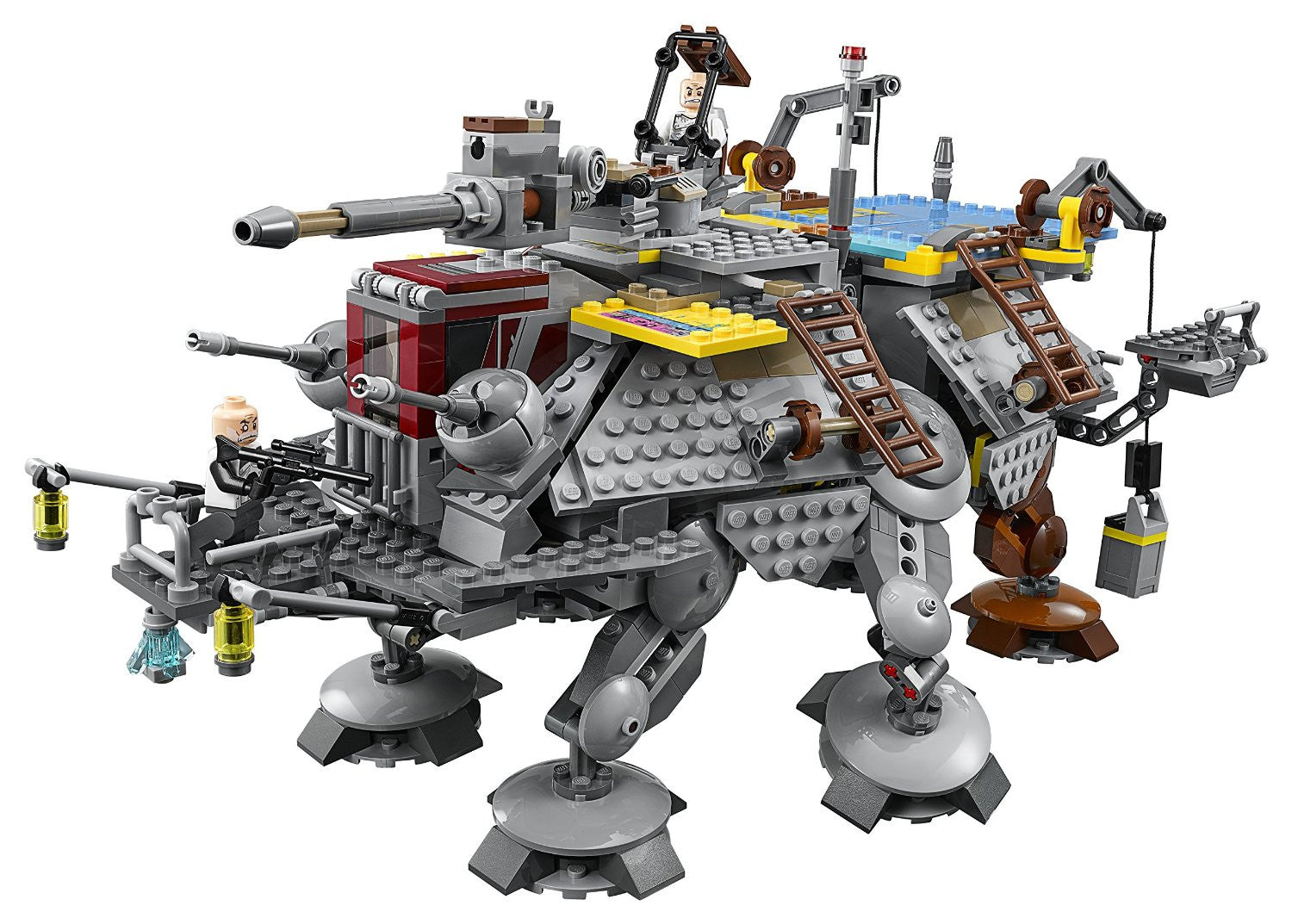 - Features a rotating top-mounted gun with spring-loaded shooter and extra ammo, 2 cranes, 4 ladders, movable legs, opening cockpit with space for a minifigure, opening rear top section, opening rear access door with 3 clones, and a built-in lifting handle