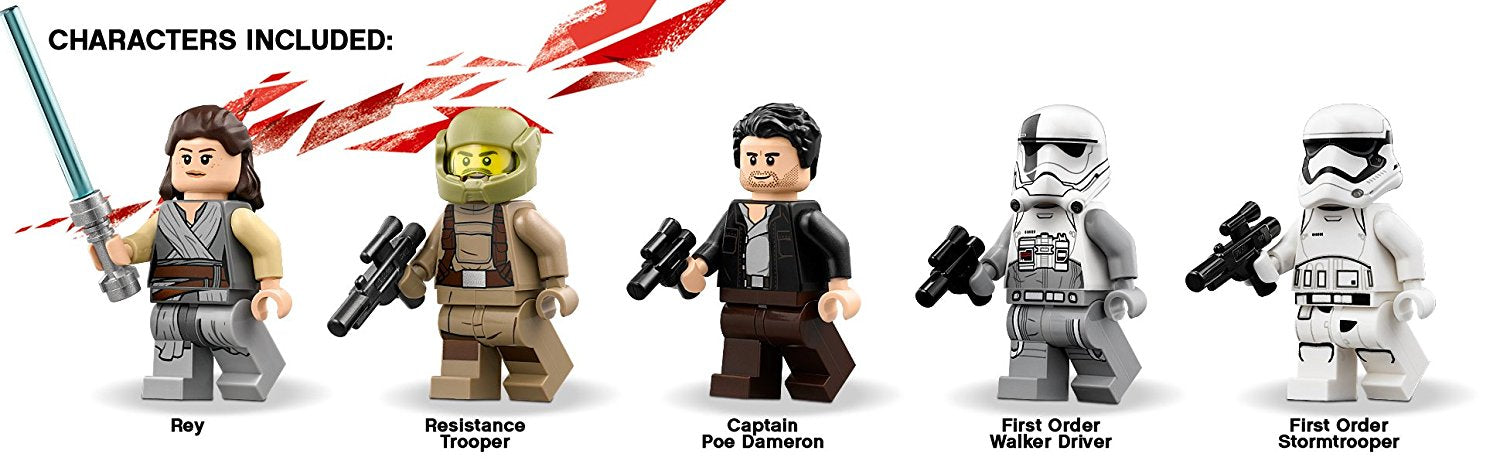 - Includes 5 minifigures: Captain Poe Dameron, Rey, a Resistance Trooper, First Order Walker Driver and a First Order Stormtrooper.